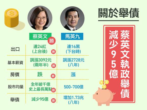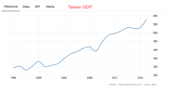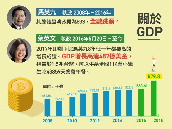 馬英九任內走出08年金融風暴後,成長率也是有起有落,但以絕對數值來看馬英九接任的2008年是417.04B USD,卸任530.61B,年複合成長率約3%。同時期全世界GDP年複合成長率約2.28%。
