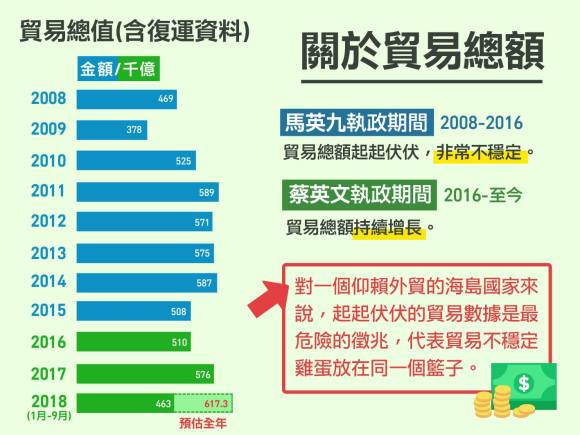 但2017年隨著美國川普上台的deregulation and tax-cutting帶來的全世界景氣大好下,蔡英文2017年全年出口額也僅比馬英九的2014年好一點。