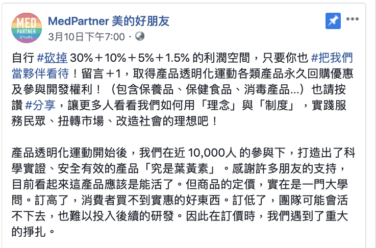 是的,姑且不論該粉專先前怎樣批判這些保健食品廠商,如今自己跳下海來,還宣稱自行砍掉46.5%利潤空間(見截圖),