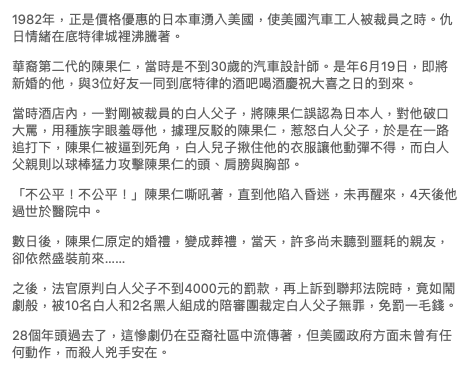殺人的白人父子( Ronald Ebens與繼子Michael Nitz)透過認罪協商承認過失致死,僅被州地方法院法官判處$3000美元罰款與三年緩刑即當庭釋放。