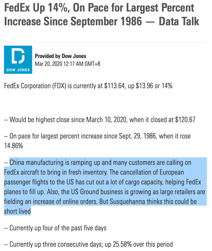 “China manufacturing is ramping up and many customers are calling on FedEx aircraft to bring in fresh inventory. The cancellation of European passenger flights to the US has cut out a lot of cargo capacity, helping FedEx planes to fill up. Also, the US Ground business is growing as large retailers are fielding an increase of online orders. But Susquehanna thinks this could be short lived"