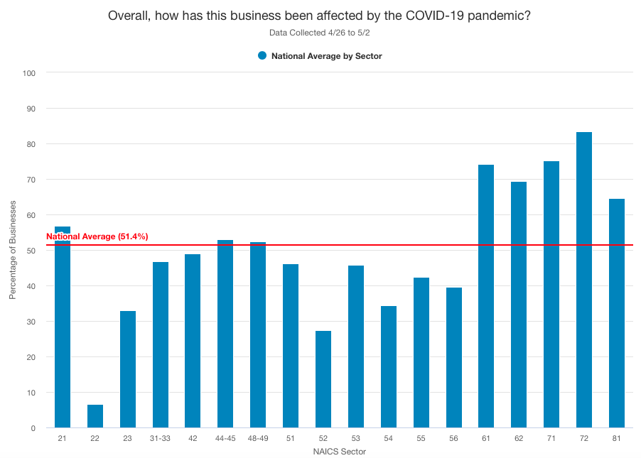 但此次對「營業中斷」定義爭議卻碰上歷史罕見的大規模被迫停業狀況,根據美國普查局 (United States Census Bureau)的資料顯示,截至今年5月8日,因被迫停業而申請Paycheck Protection Program (PPP)的中小企業高達360萬家,借款金額達$5370億美元。4月26日~5月2日該週資料更是超過51.4%企業受到疫情影響(見圖)。