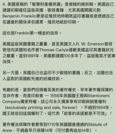 2018年4月「中美貿易戰之我見」一文中我提到美國建國初期也是瘋狂竊取歐洲技術、盜版歐洲書籍,對智慧財產權壓根就沒尊重過。(見截圖)