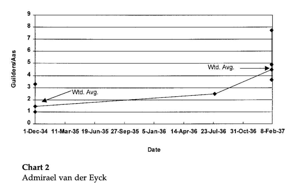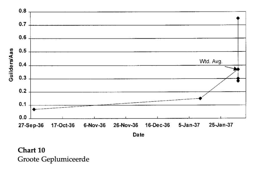 1. 實際上鬱金香熱潮時間相當短,價格明顯彈升發生在1636年11月~1637年1月份。