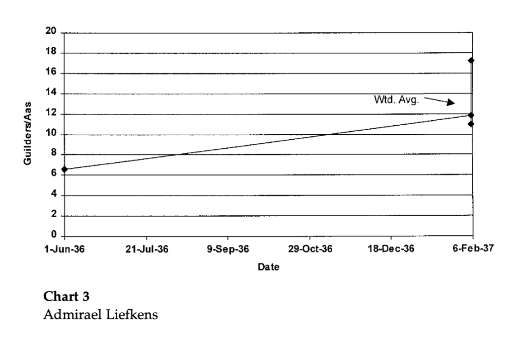 2. 參與人數總共約350人,全是職業商人;真正支付高價(超過300荷蘭盾)者約莫10人,多數人其實是透過遠期合約的方式進行炒作,而最後多以違約拒絕真實支付現金,直到荷蘭當地鬱金香相關商會與政府出面介入,才以履約價格的10%甚至5%方式解除合約。