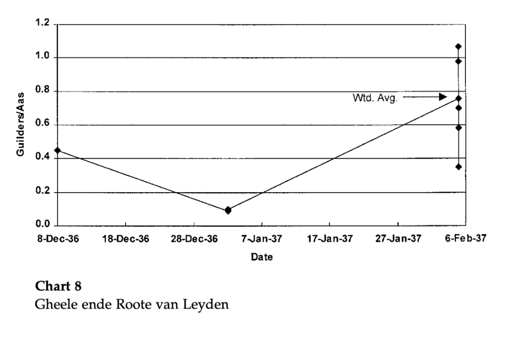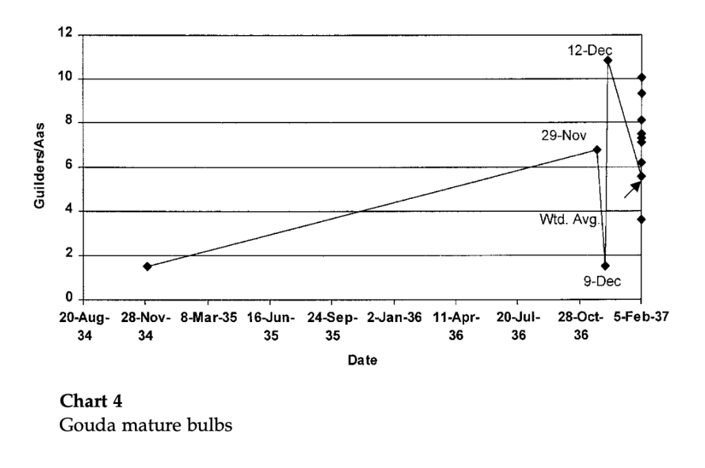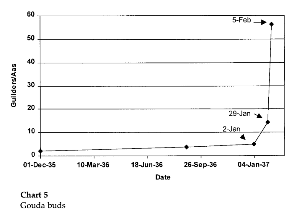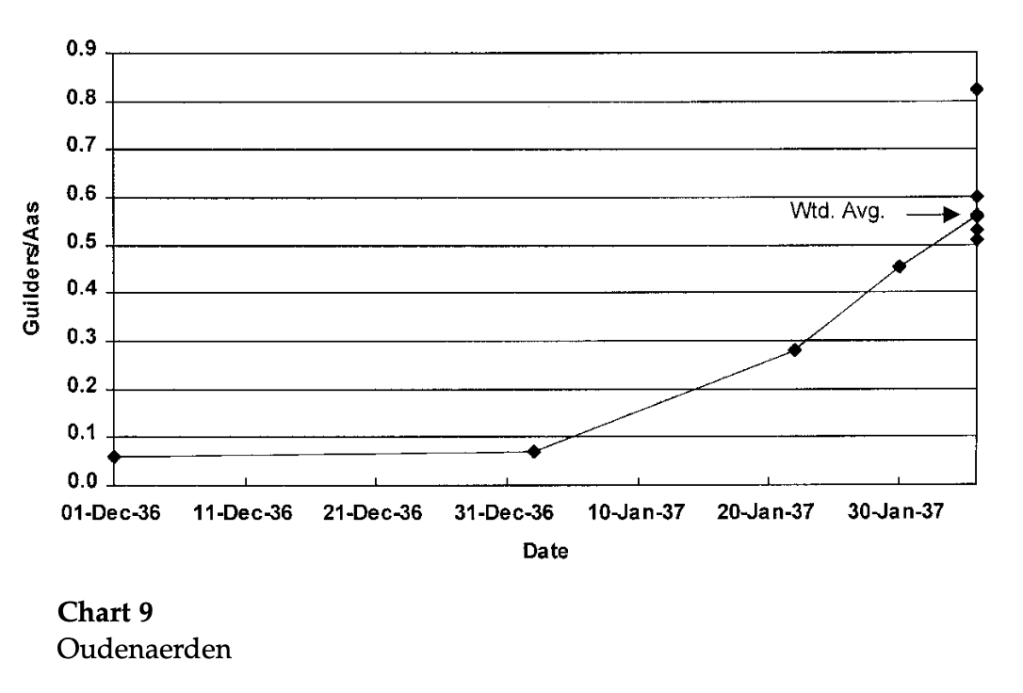 漲幅較大的主要是那些本來就平價的品種,例如Gouda buds,起漲價格約2荷蘭盾,最高價50多荷蘭頓。即便存在瘋漲,但至多也是一、二十倍,這即便放在現代農產品供需失調時的價格軌跡來比較,也並不離奇。例如台灣颱風後的香菜價格漲幅。