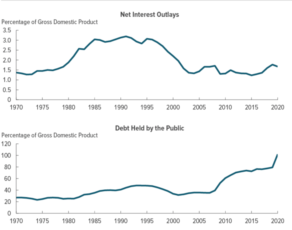 美國聯邦政府2021年政府負債$28.5兆美元,是GDP的128.31%。僅利息支出達$4025億美元,佔年度預算5.3%,佔聯邦稅金收入9.8%。如果美國無法成功抑制通貨膨脹,則隨之而來的利率飆升將造成美國財政風險。畢竟市場利率始終是由「無風險利率+風險貼水+預期通貨膨脹率」組成。