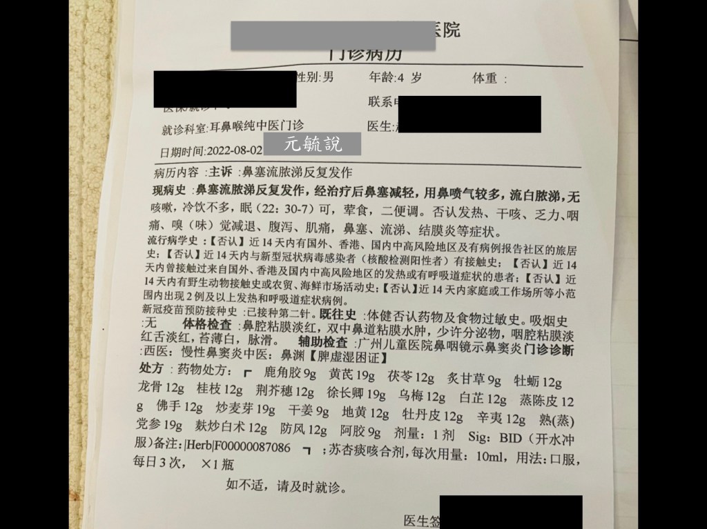 四歲孩童,鼻塞,鼻涕濃稠且不時大量流出,鼻涕有時黃綠有時濃白,症狀超過半年,十分痛苦,連夜間都因此無法入眠,哭鬧不休。