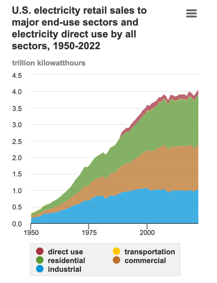 我們可以數據圖看到美國從2000年之後事實電力消費成長是近乎停滯的。同時期中國電力消費卻仍相對高速增長。