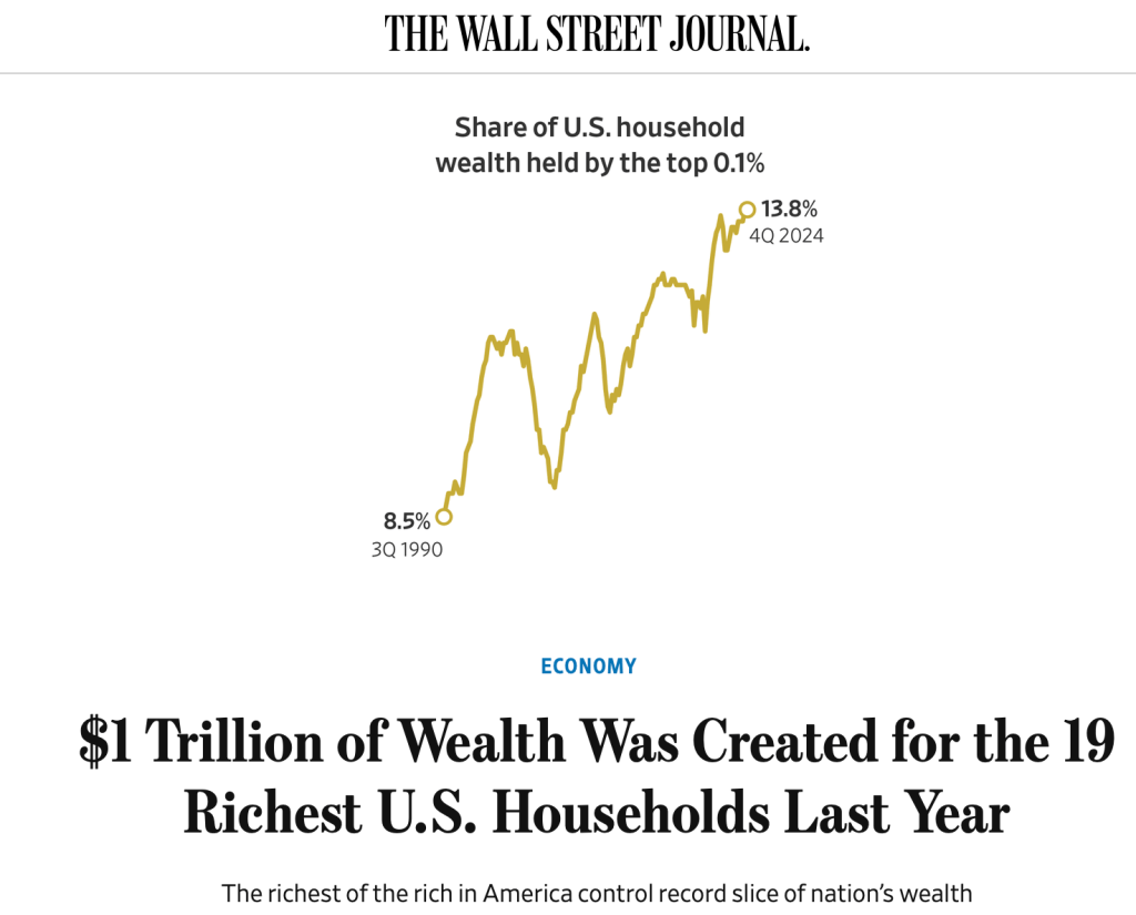根據經濟學家加布里埃爾・祖克曼(Gabriel Zucman)分析,2024年美國最富有的19戶家庭共創造了1兆美元的新財富,佔全國家庭財富的1.8%,是自1913年以來資料紀錄中的最大單年增幅。這些「超級億萬富翁」的家庭每戶淨資產皆超過450億美元,其中包含馬斯克、貝佐斯、祖克柏、比爾蓋茲、巴菲特與私募巨頭施瓦茨曼。
