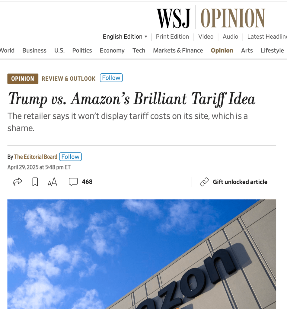 誠如這篇社論所言:既然川普選前曾說「關稅(tariff)是字典中最美好的字」,那為什麼不讓電商平台列出來給大家瞧瞧呢?