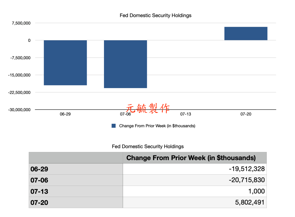 Fed持續賣出國債的舉措只到7/6那一週,之後一週不但沒有減持,7/20當週甚至是增持$58億美元的國債。