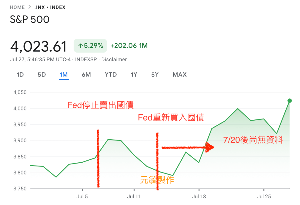 從一個簡單的角度可以這樣看:Fed賣出國債是收回流通貨幣,買入則是放出。因此,7/20當週是貨幣開閘放水。說一套做一套?身為投資人只能持續觀察。