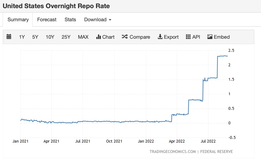 2020年初因為Covid-19疫情Fed的瘋狂印鈔放水下,repo rate兩年時間被打壓至0%,然而最近一稍微收緊貨幣閘門,4月~7月馬上回到1.5%水平,尤其對應到6月底Fed賣出約$400億美元國債,repo從不到1%跳升到1.5%,Fed從7月開始停止賣出甚至買回國債,repo則持平在1.5%這個現象,可否推論此利率對Fed實際縮表作為有影響?我們外人無從得知,但repo rate始終是快速判斷市場流通貨幣水平的一個好工具,我認為Fed不可能不參考。尤其2019年9月事件Fed的反應可窺知一二。我推測如果未來Fed縮表過程如果repo rate有跳升現象,則Fed很可能會根據歷史經驗改變實際貨幣調控舉措。