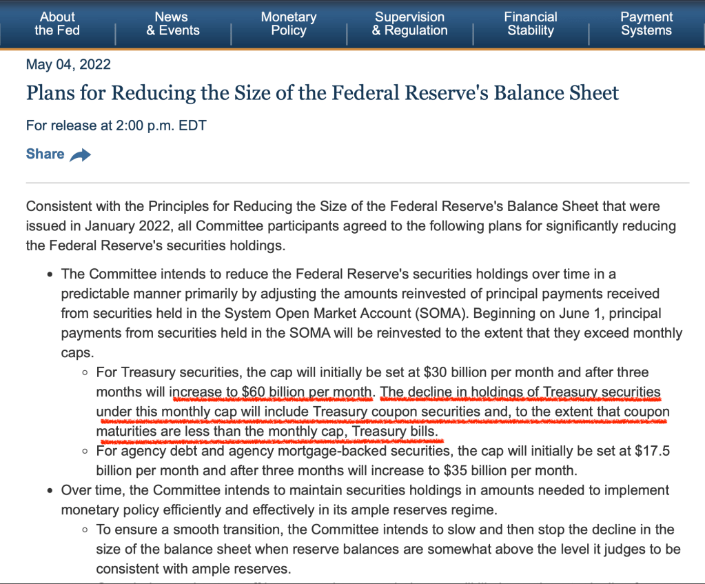 Fed即將進入每月縮減$600億美元資產的進程,根據計畫(見截圖),若該月到期國債不到$600億美元,則Fed將賣出短期的Treasury Bill彌補差額。