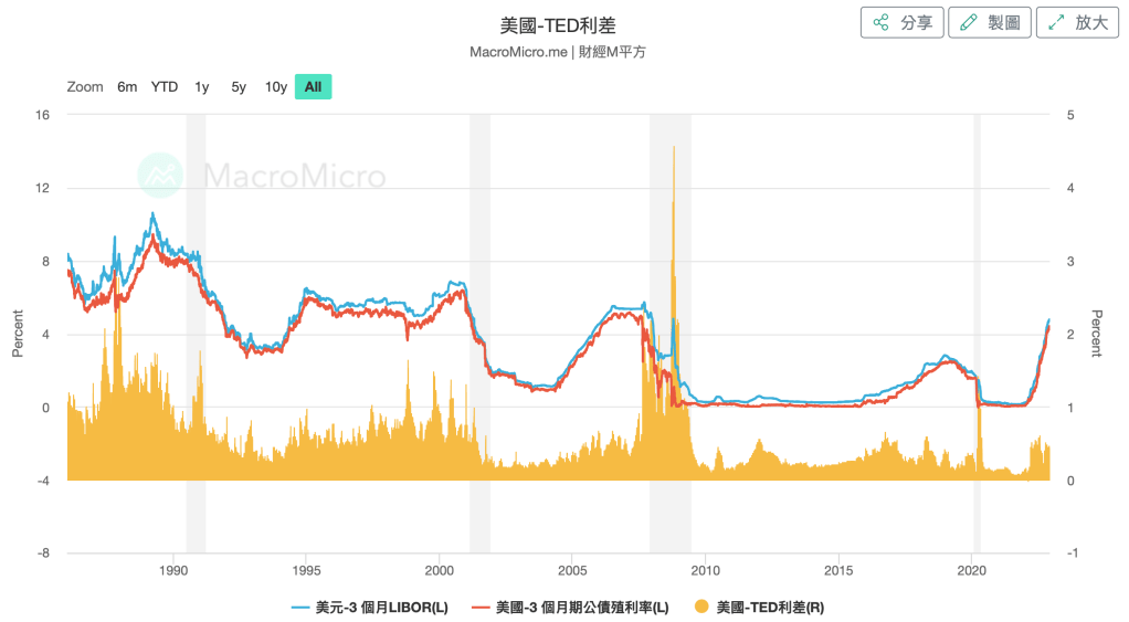 特別是當下美國Overnight Repo rate來到近年最高點3.85%,逼近幾次股災(如2008年)前水位。美國TED例差亦然,在在說明市場短期流動性逐漸緊縮的現狀。(見圖)